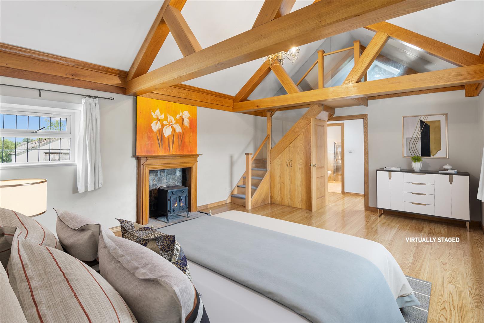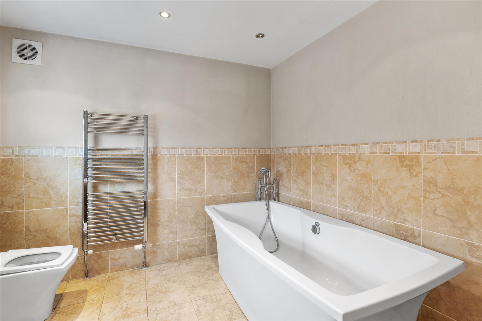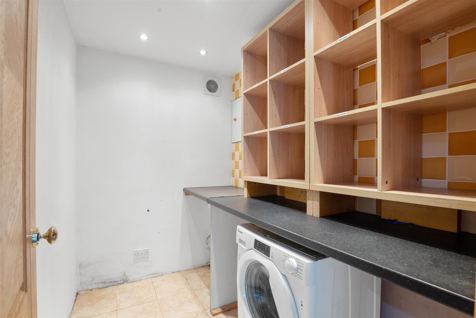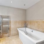 accessed via a small set of stairs within the bedroom. Also to the left wing is a family bathroom with white sanitaryware and full height tiling, and a laundry room. To the right, you will find a