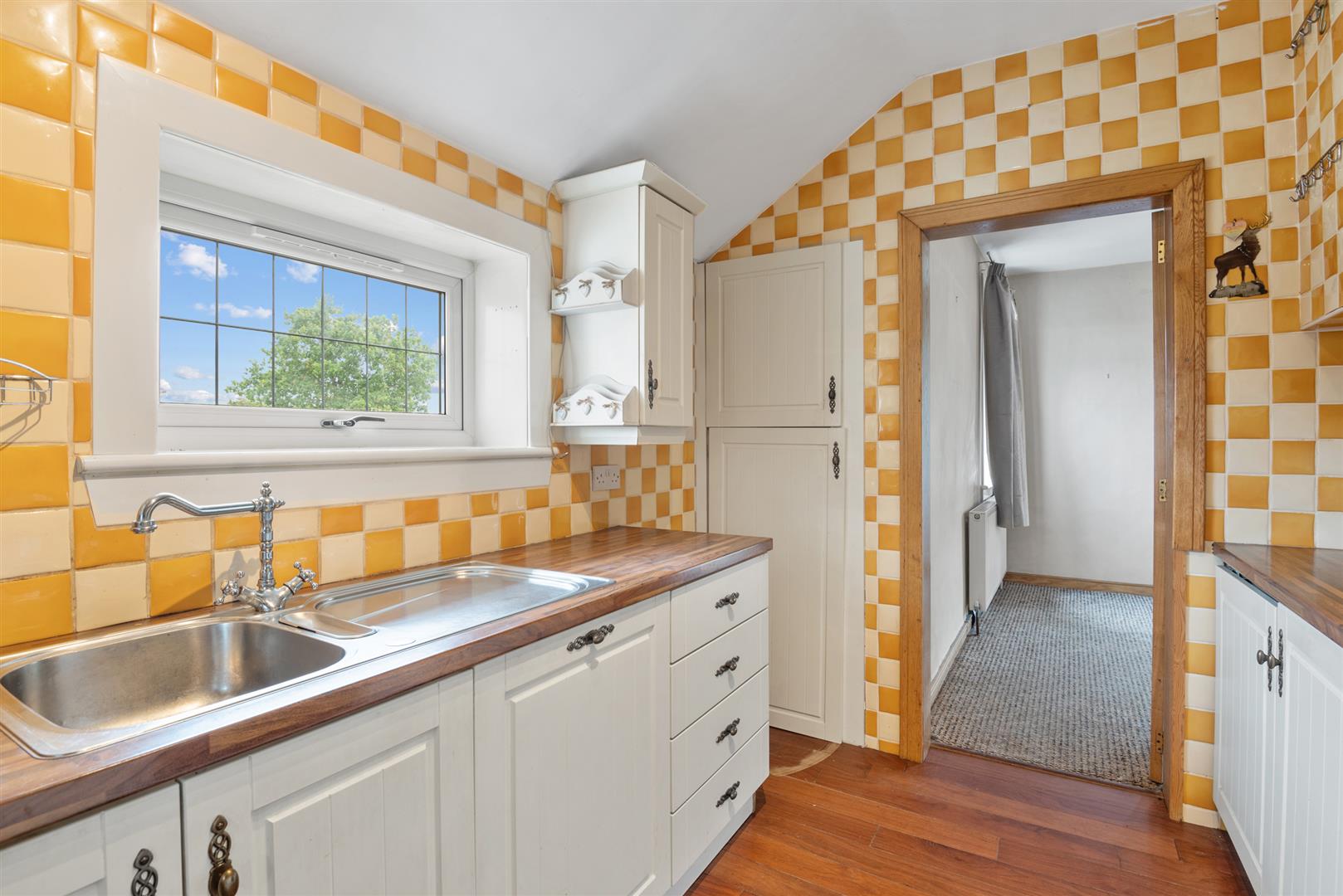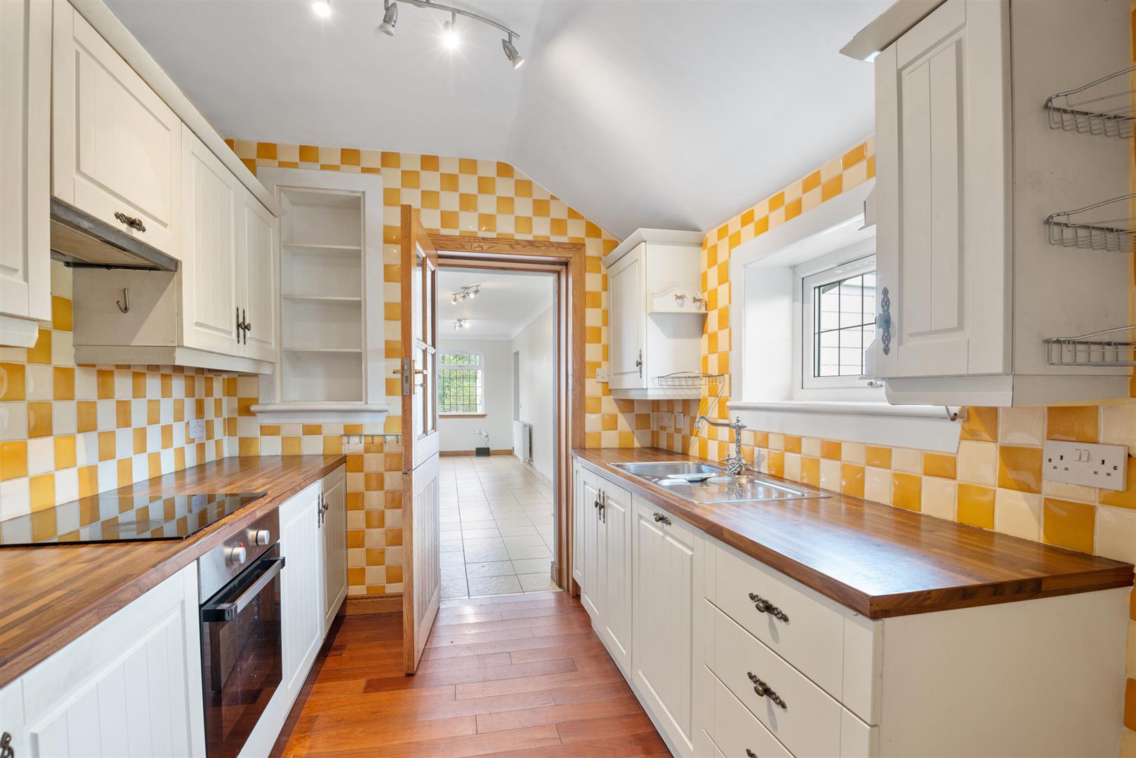 traditional farmhouse kitchen with wall and floor mounted cabinetry and feature tiling to the walls, which leads to the spacious living room and sunroom. Bedrooms 2, 3 and 4 are located in this