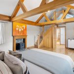 an expansive foyer giving access to the left and right wings of the property. To the left, you will find the generously sized master bedroom with wooden beam ceilings and a bonus additional space