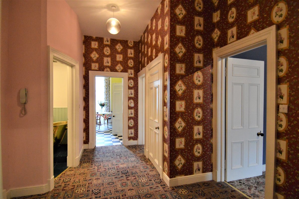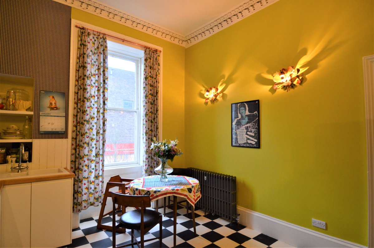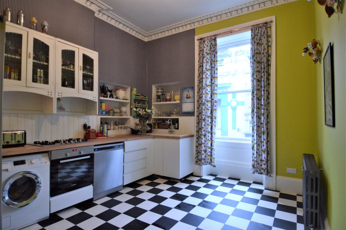 The property enters into a spacious hallway with a storage cupboard and doors to all apartments. The sitting room is bright and spacious, with windows offering a view of C R McIntosh Art School and a door to the dining kitchen. The dining kitchen is fully fitted with a range of wall and floor mounted units, a gas hob and oven and has ample space for a dining table. It further features ornate cornicing and a window overlooking the front.